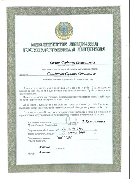 Сагиданов Самат Серикович – юрист, оказывающий услуги физическим лицам по гражданскому, трудовому и семейному праву, а также занимающийся представительством в суде, составлением договоров, соглашений и других юридических документов. В этот перечень входят: - взыскание задолженности по распискам, споры по договорам (купля/продажа, договор о ремонтных работах и пр.), - оформление разводов, урегулирование в судебном или нотариальном порядке вопроса об алиментах, - споры по принудительному выкупу государством земельных участков или квартир. Для юридических лиц предусмотрена услуга полного юридического сопровождения бизнеса, включающая: - разрешение любых споров в области трудового, гражданского права, административного права - представительство юридических лиц в суде по вышеуказанным спорам - обжалование решений государственных органов (об отказе в регистрации, перерегистрации, выдачи разрешений и пр.) - оформление документации по трудовому праву и пр. - составление договоров Показателем работы Самата, в первую очередь, является КАЧЕСТВО и нацеленность на результат, обусловленный тщательной подготовкой к решению вопроса.